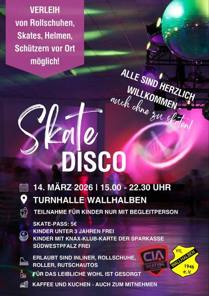 Skate DISKO am 14.03.2026 von 15.00 bis 22.30 Uhr in der Turnhalle Wallhalben